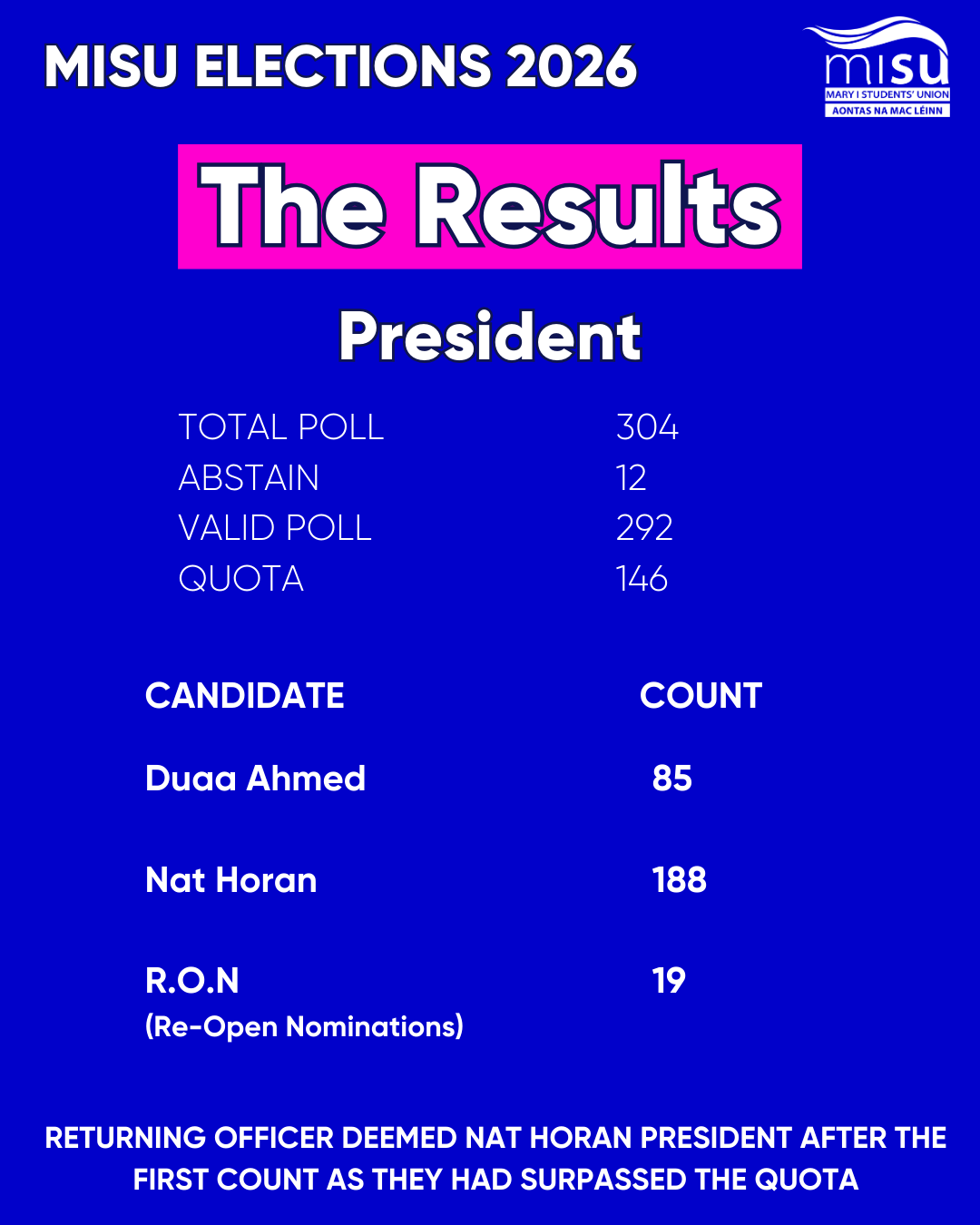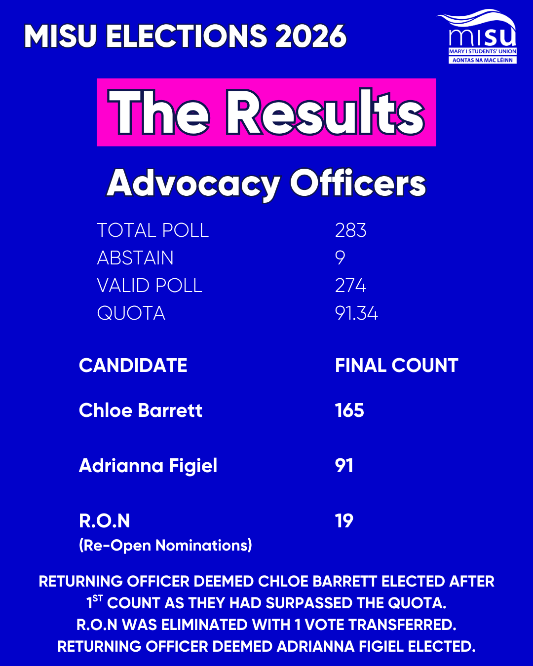 RETURNING OFFICER DEEMED CHLOE BARRETT ELECTED AFTER 1ST COUNT AS THEY HAD SURPASSED THE QUOTA.